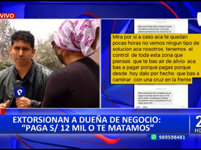 “Te podemos secuestrar a un familiar si no nos colaboras, queremos 12,000 soles por la vida y tranquilidad de tu negocio y si quieres que te demostremos con hechos, primero vamos por pasos y lo primero será meterte dos dinamitas en tu negocio y tu casa”, se puede leer en el mensaje de extorsión que habría recibido la víctima.