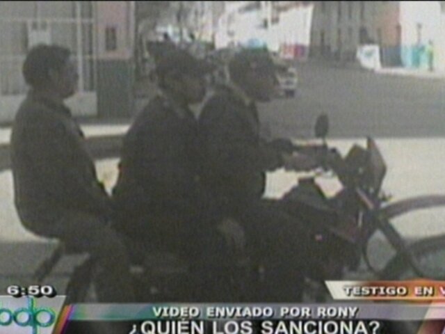 Dos efectivos viajan a bordo de una moto lineal sin ningún casco de seguridad; pero lo peor de esto, es que en la misma unidad llevan a una tercera persona a punto de caer. Nuestro televidente identificado como Rony aseguró que esta es una situación que se repite a diario sin que nadie pueda hacer nada al respecto.