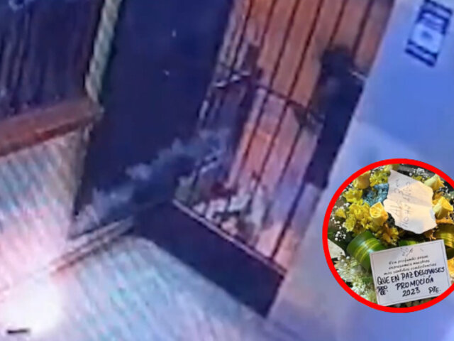 Cámaras de seguridad captaron a dos sujetos que llegaron al lugar abordo de una motocicleta. Ellos descienden y dejaron el arreglo fúnebre en la puerta del local. Luego dejaron el artefacto explosivo, pero no lo encendieron.