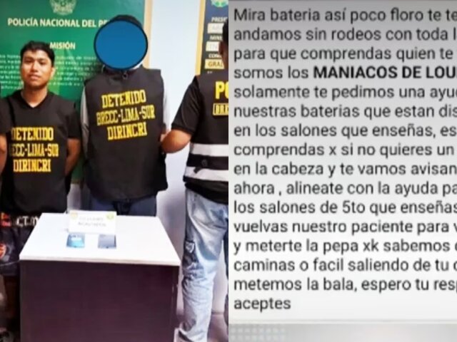 Dos estudiantes de quinto de secundaria del colegio República del Ecuador, ubicado en el distrito de Villa María del Triunfo, fueron intervenidos por la Policía al ser señalados como presuntos responsables de un caso de extorsión contra docentes de la institución educativa.