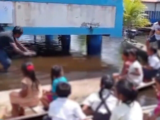 En Loreto, los escolares del colegio San José de Samiria vienen recibiendo clases en canoas, debido a que su centro educativo se encuentra inundado debido al desborde del río por las intensas lluvias.