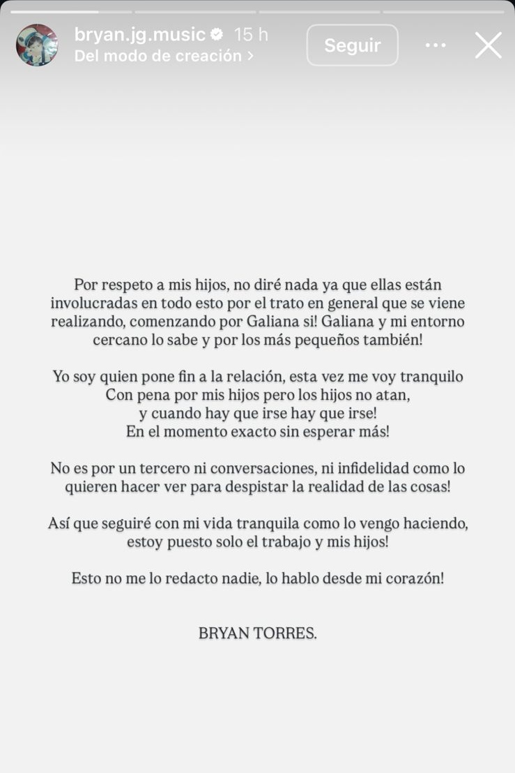 A través de un comunicado difundido en redes sociales, Bryan Torres aseguró que la decisión de terminar la relación fue suya y explicó que actuó “por respeto a sus hijos”.Yo soy quien pone fin a la relación, esta vez me voy tranquilo. Con pena por mis hijos, pero los hijos no atan y cuando hay que irse, hay que irse”, expresó el cantante.