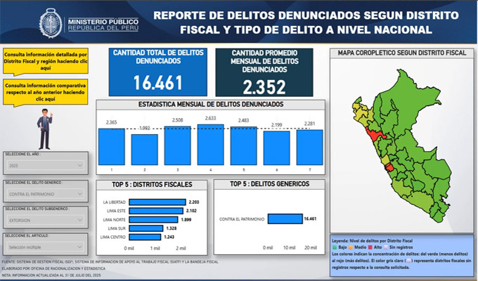 Tras una detallada recopilación de información, el Ministerio Público presentó un reporte estadístico de las cifras de delitos denunciados según distrito fiscal y tipo de delito, desde el 2020 hasta julio de este año. Aquí, los números de la criminalidad en el país.