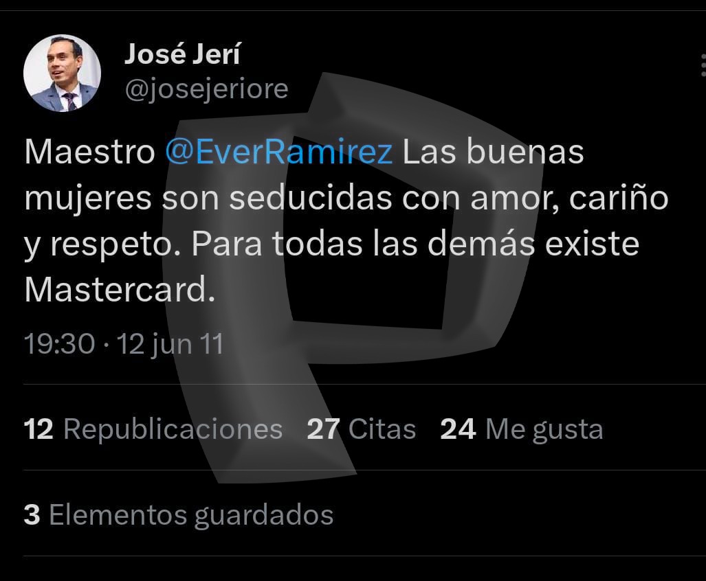 “Maestro @EverRamirez Las buenas mujeres son seducidas con amor, cariño y respeto. Para todas las demás existe Matercard”, se lee en la publicación que data del 12 de junio del 2011. Otro comentario del 16 de febrero de 2013 dice: “Lo que me gusta de toda fiesta infantil, las animadoras! Son un encanto!”.