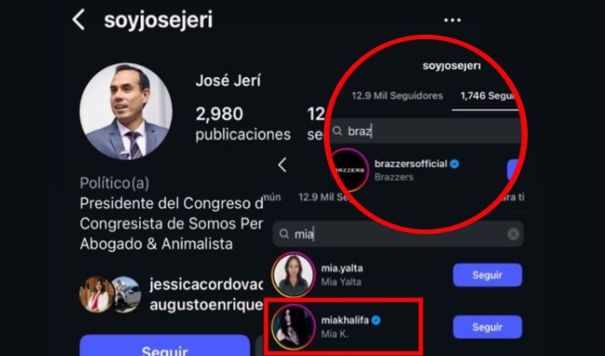 En su cuenta de Instagram, José Jerí seguía a Mía Khalifa, quien es popular por ser una recordada actriz para películas de adultos, y también a la cuenta Brazzers, que es una productora de sitios web para adultos canadiense, según informó un usuario de X. Por otro lado, se compartieron publicaciones en X de una cuenta que sería de José Jerí y que generaron polémica.