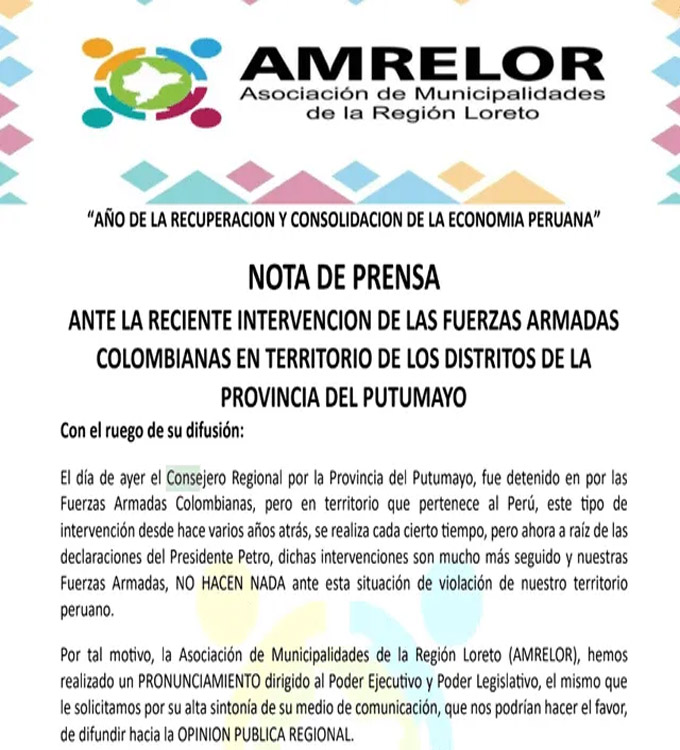 Finalmente, la Asociación de Municipalidades de la región Loreto pidió a la presidenta de la República, Dina Boluarte Zegarra, actuar en defensa de la población loretana, "que siempre hemos defendido nuestras fronteras y estamos dispuestos a seguir haciéndolo", manifestaron en el documento.