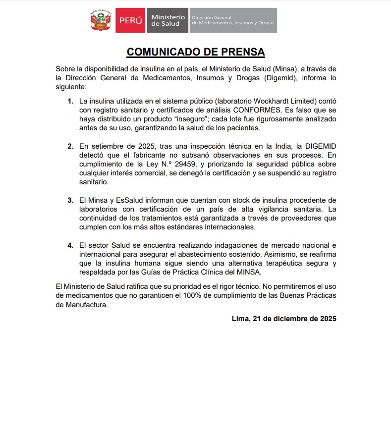 En respuesta, el Minsa y Digemid aseguraron que la insulina utilizada en el sistema público cuenta con registro sanitario vigente y certificados de análisis conformes, y negaron la distribución de productos inseguros. Precisaron que en setiembre de 2025 se suspendió el registro del fabricante Wockhardt Limited por no levantar observaciones, en cumplimiento de la Ley Nº 29459, y que Minsa y EsSalud disponen de stock de insulina de laboratorios certificados, incluida la insulina humana como alternativa terapéutica respaldada por las Guías de Práctica Clínica del sector Salud.